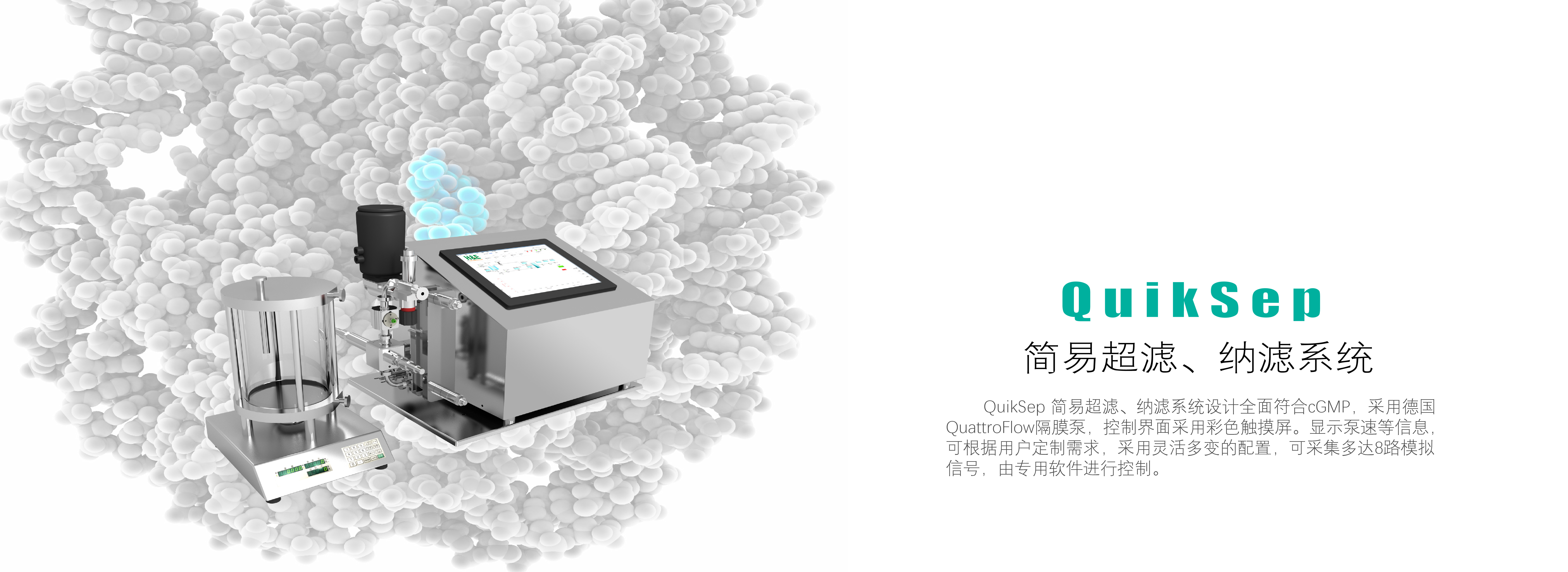慧德易科技QuikSep 生物智能泵是通過軟件控制隔膜泵的轉速,配合衛生級壓力流通池及管路,通過實時壓力檢測和電機配合,實現恒流和恒壓,防止泵超壓,實現定時定量,適用于生物制藥在層析、過濾、料液轉移等各種輸送液體的應用。