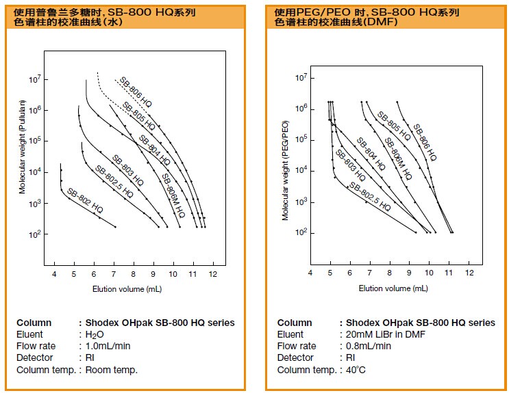 SB-806 HQ色譜柱是聚合物基質的水溶性SEC色譜柱,適用于各種分子量范圍的測定。溶劑可用DMF替換(除SB-802 HQ和SB-807 HQ以外),可分析極性聚合物。SB-804 HQ、SB-805 HQ可用于測定明膠的平均分子量。