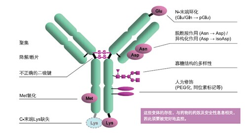 ????抗體是一種結構復雜的糖蛋白。即使是天然抗體,其結構也是各不相同。抗體類藥物在其生產工藝(培養(yǎng)、分離純化)或貯存過程中容易導致產品的不均一性,所以在藥物研發(fā)以及純化、生產過程中,對抗體藥物的定量和定性的分析時非常重要的。