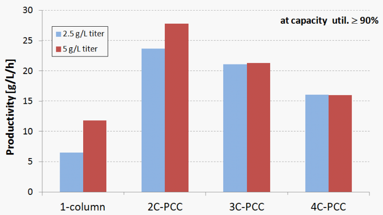 3.載量利用率> 90%的多柱位系統產量對比圖。其顯示了典型上樣濃度2.5 g/L和5 g/L的影響結果。2C-PCC比普通批處理和更復雜的3柱位、4柱位設計更具優勢。*