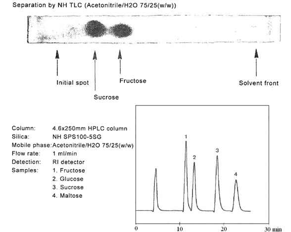 在使用NH MB 100-75/200SG填料之前最好做一下預實驗。以下是使用NH 薄層板和NH2 SPS 100-5SG做的預實驗。
