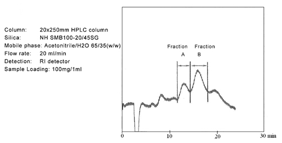 ? ? ? 糖類物質的分析和制備,在液相色譜領域占有重要的地位。迄今為止,大多數的分離介質僅僅局限在分析級別。但是富士硅膠研發出用于制備色譜的新的氨基硅膠。當使用高水相為流動相時,一般的氨基填料會暴露出很多問題。氨基硅膠的pH值很高,一般pH為9.0,在這樣高的pH條件下,目標化合物一般都會變性,并且會毀壞硅膠基質的表面。考慮到這些問題,富士公司研發出新的氨基硅膠填料,稱之為NH SG硅膠。NH SG硅膠可以最小化甚至是避免上述問題,并且對糖類化合物進行更好的分離。